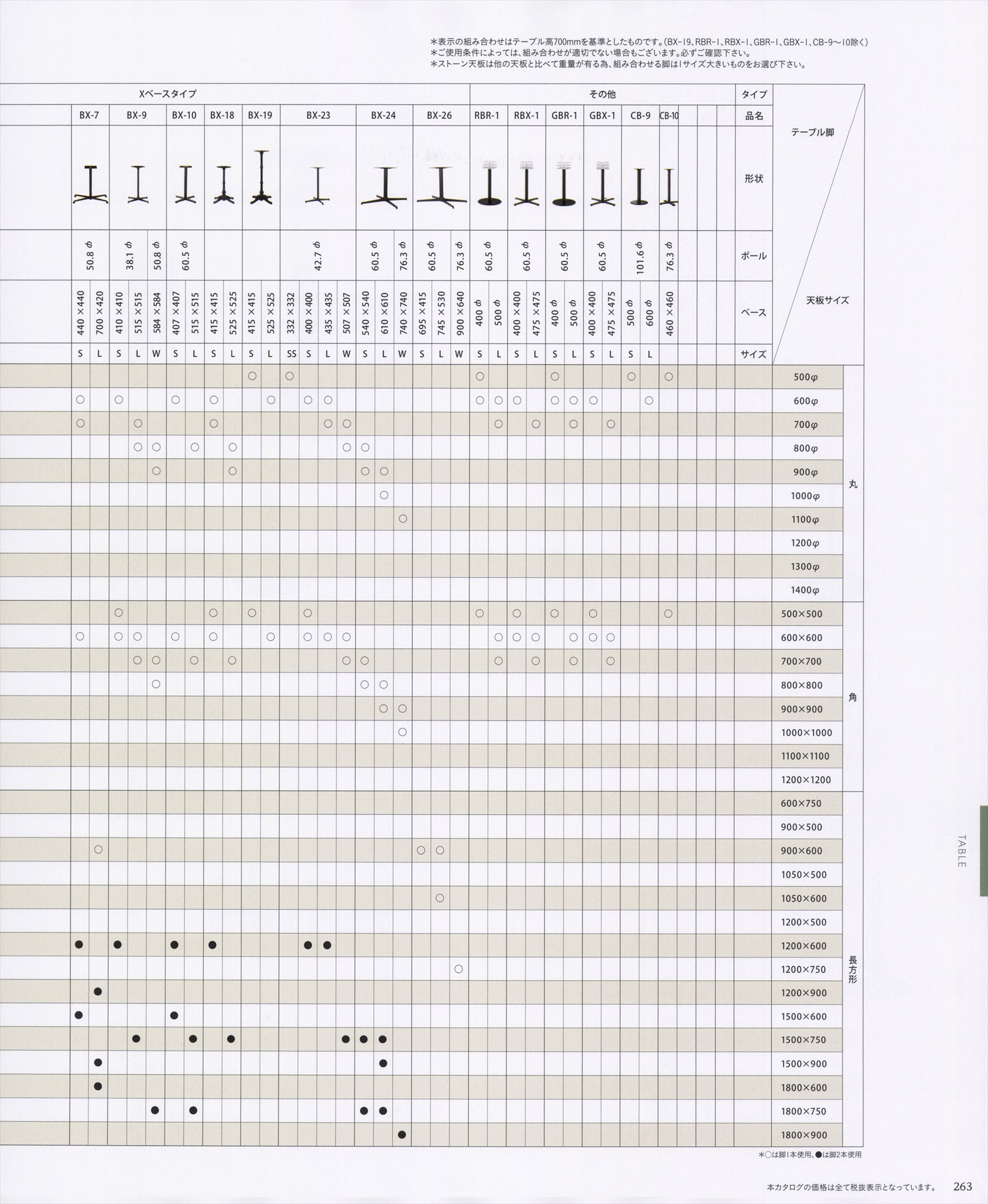 TABLE LEG INFORMATION(テーブル天板とテーブル脚の組み合わせ一覧表)
